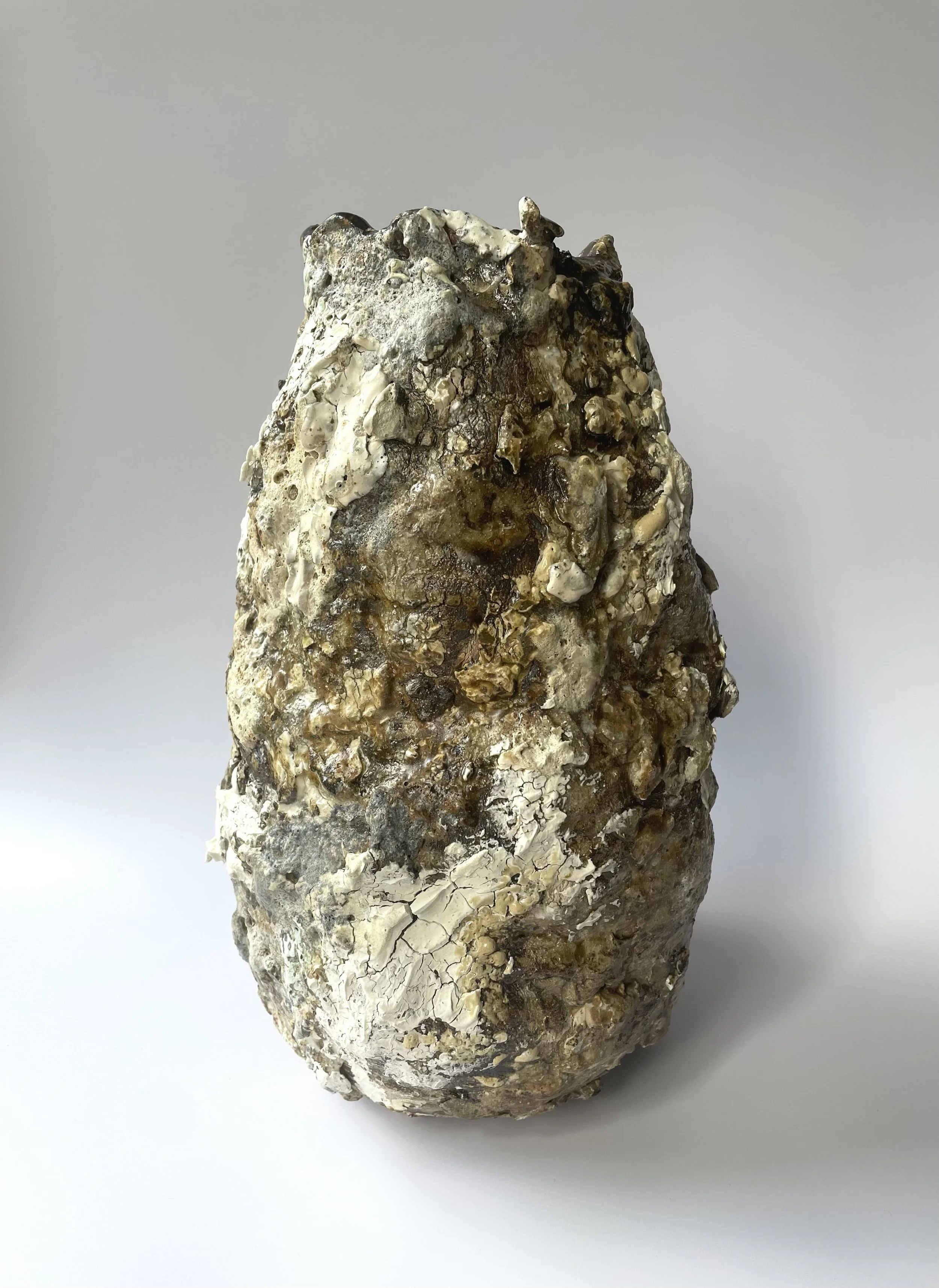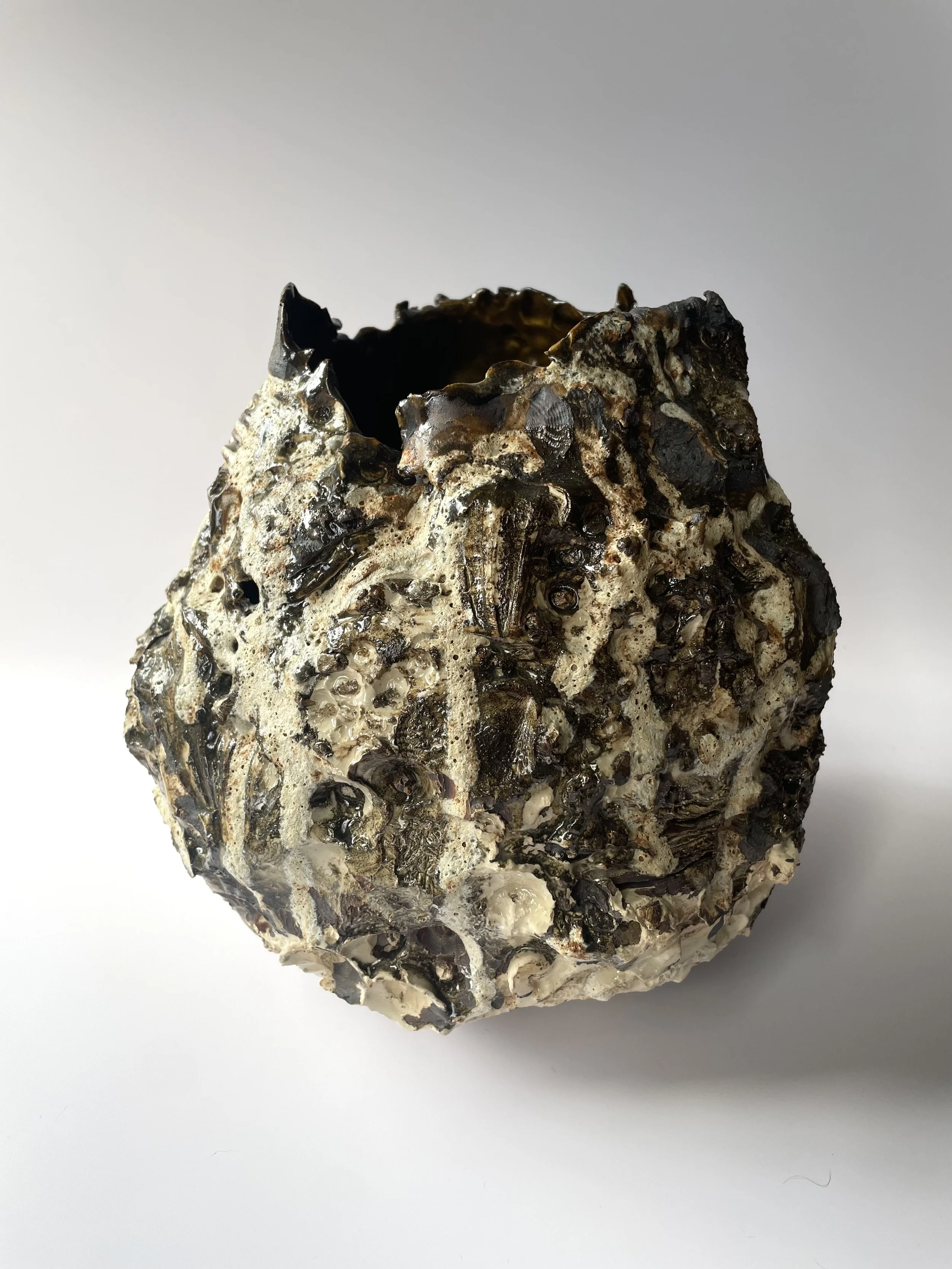 A ceramic vase with an irregular, textured surface resembling oyster shells, mainly in shades of black, white, and beige.